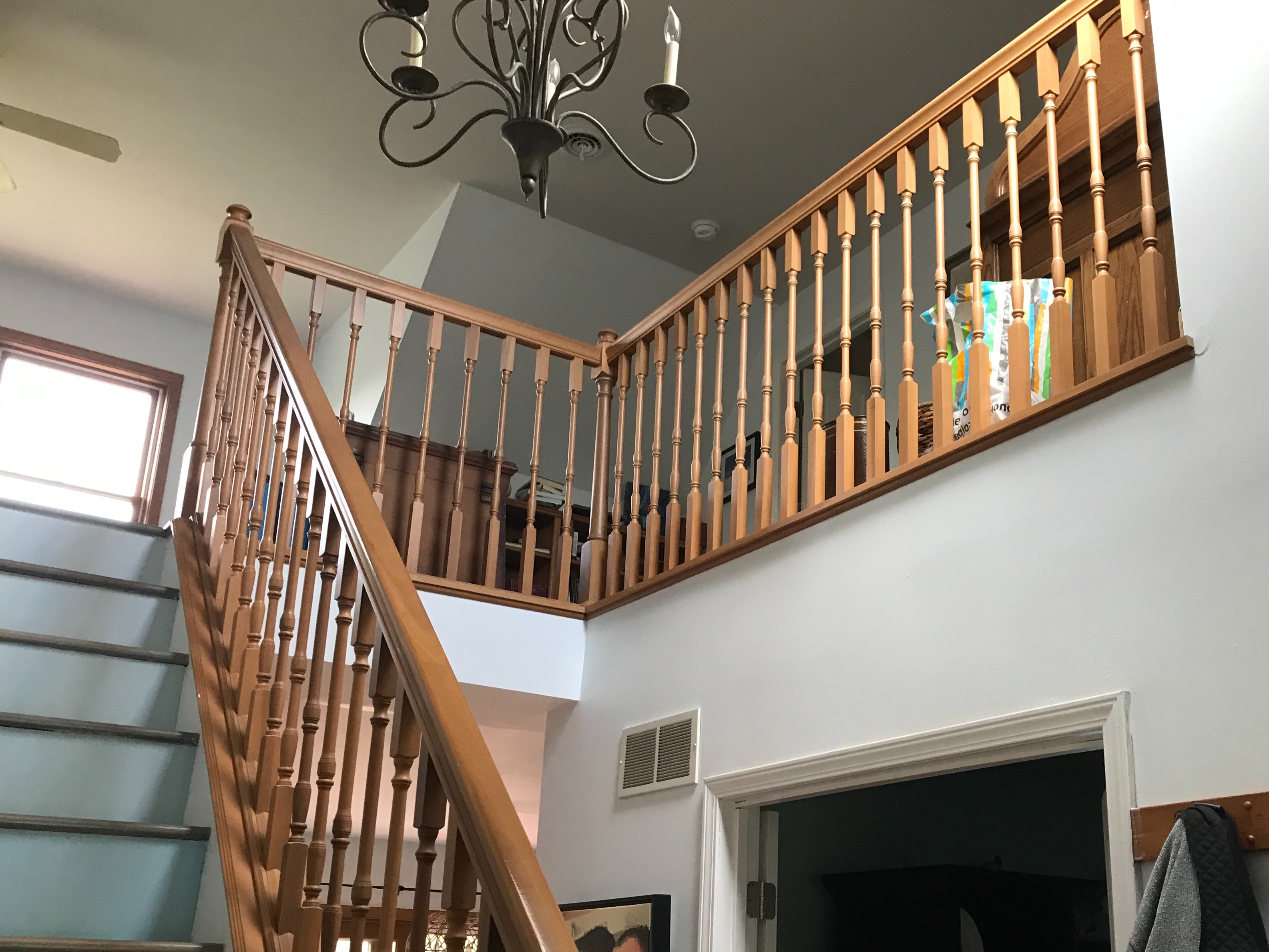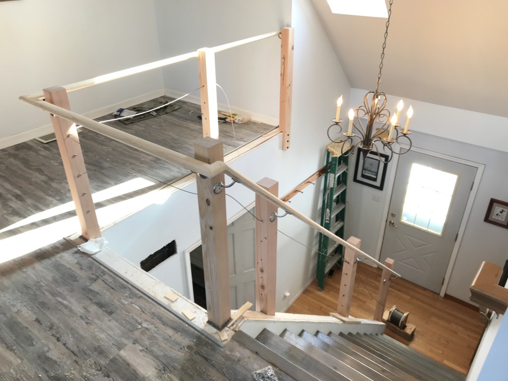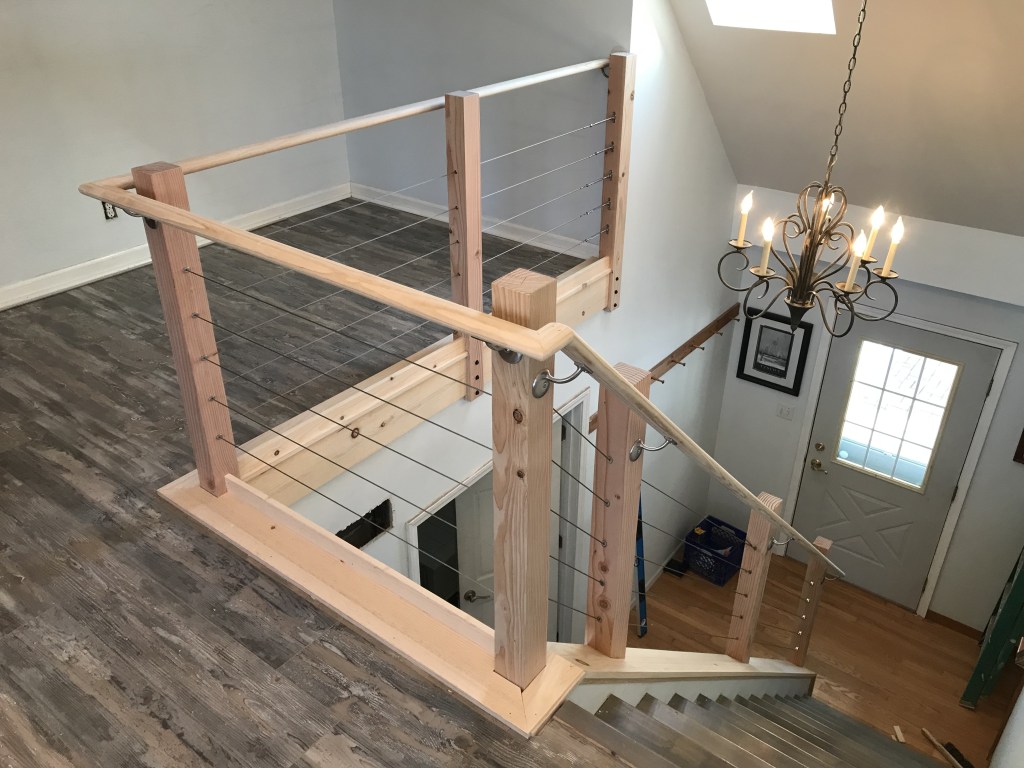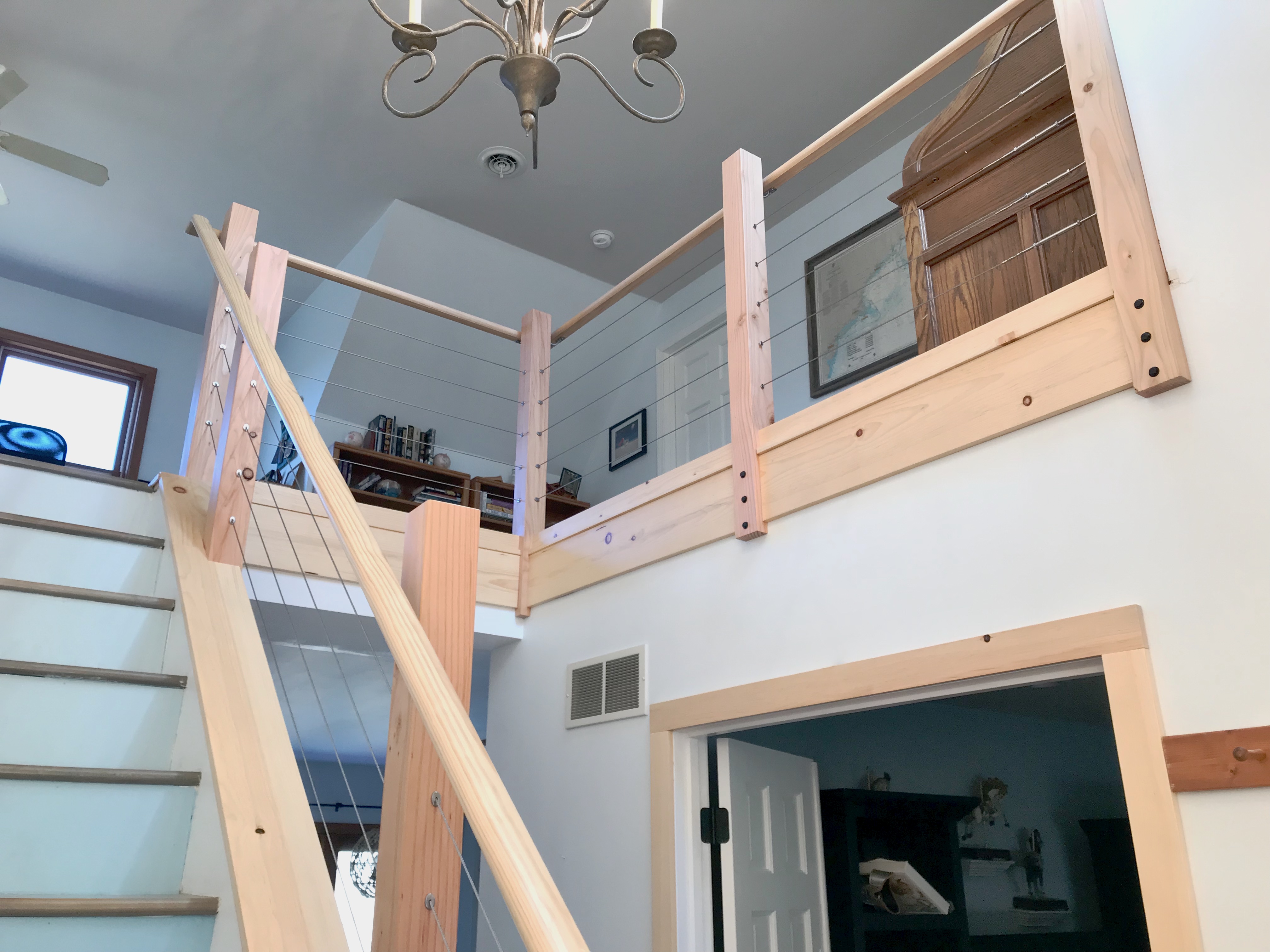 When we showed up, Alix was armed with a clipping from a magazine. “I want something like that,” she said. It was a picture of a stairwell done in natural pine trim and stainless steel cable railing. The lines were clean and it had a much more open feeling than the existing railing.